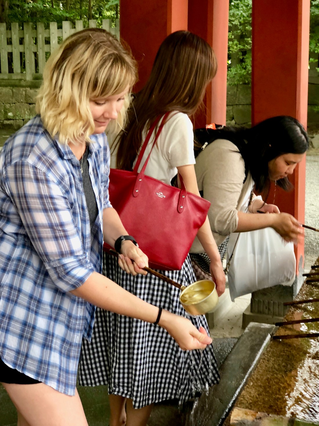 There is a specific order and way of performing this cleansing ritual. First you pick up a ladle with your right hand and scoop water to pour over your left hand washing it. Then transfer the ladle l to the clean hand and do the same for your right. Transfer the ladle back to your right hand and scoop water with it and pour it into your left hand making sure to leave most of the water int he ladle. Take a mouth full of water from your left hand and swish it around. Cover your mouth with your left hand and spit the water our beside the basin (not into it!). Finally tip the ladle forward and let the water wash down one the handle and your hand to cleanse it finally retiring it to the basin where it was resting.