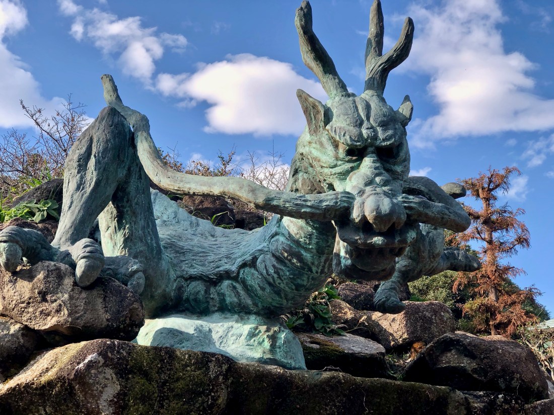 Tsurugaoka Hachimangu is Kamakura’s most important shrine. It’s reached by a long wide walkway on Dankazura Street lined with hundreds of lanterns (electric) and cherry trees from the waterfront down the center of the main street. The walk begins with a red tori (gate) flanked by 2 guardian shishi (lion dogs).